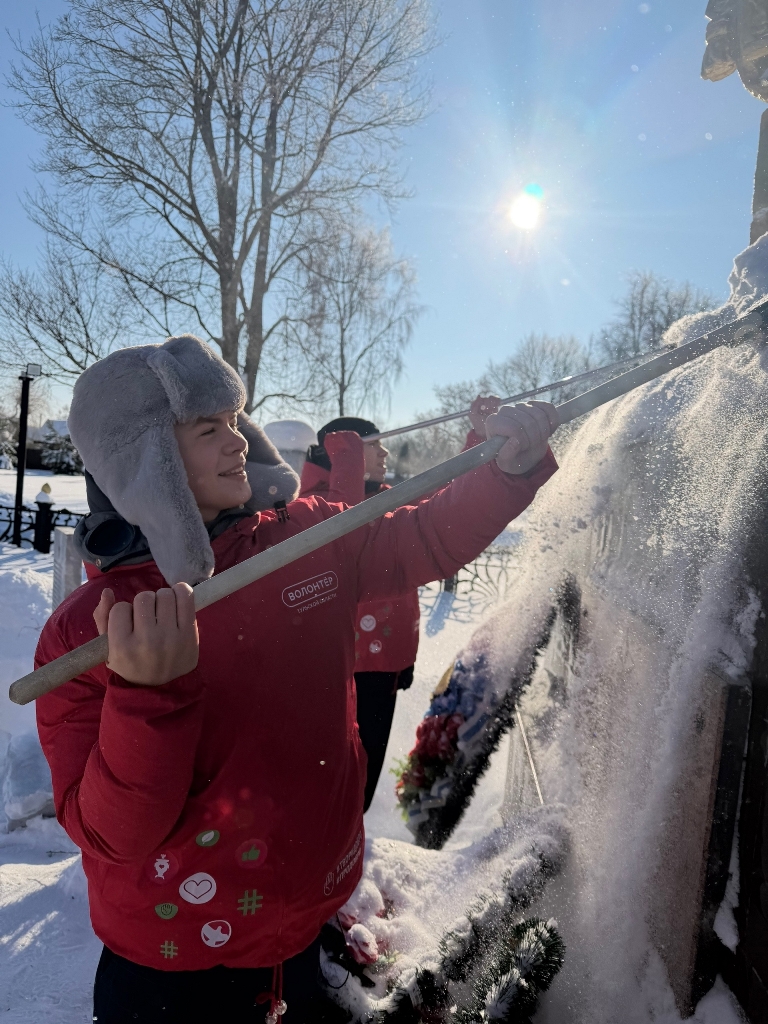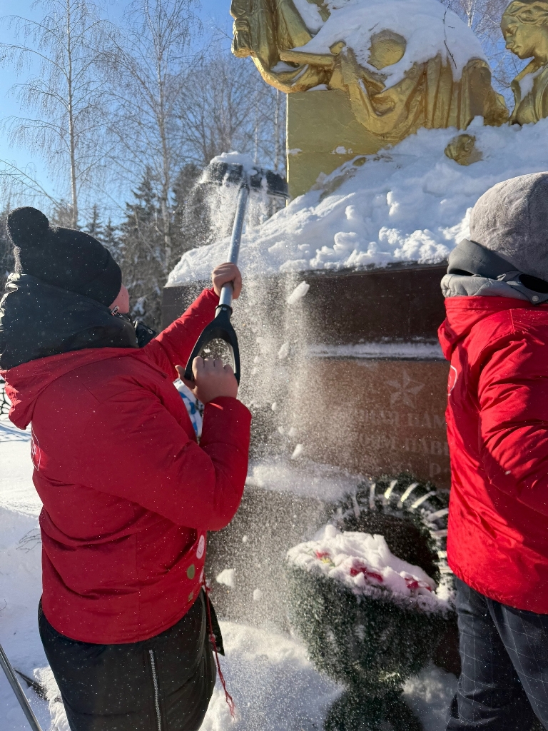 Совместно с участниками военно-патриотического объединения «Патриот» волонтеры вышли на борьбу со снегом, чтобы очистить от него мемориал «Скорбящая мать». Этот памятник – символ нашей общей скорби и вечной памяти о тех, кто отдал свои жизни за мирное небо. И очень важно, чтобы он всегда был чистым и ухоженным, независимо от погоды.
