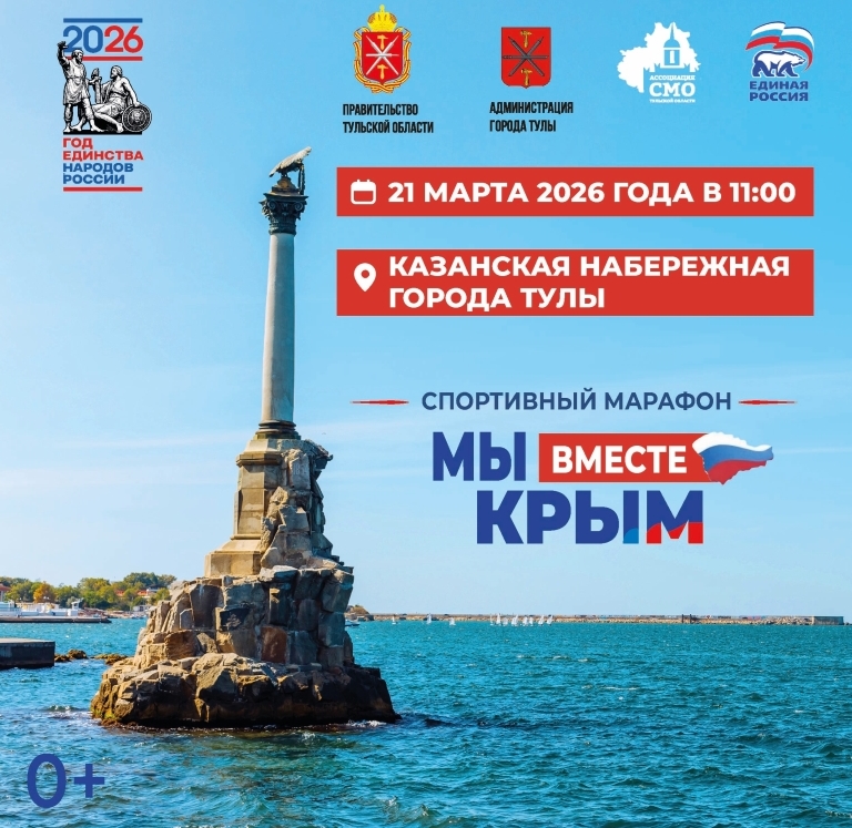 21 марта в 11.00 на Казанской набережной Тулы пройдет спортивный марафон «Мы вместе Крым». Мероприятие приурочено к 12-й годовщине воссоединения Крыма и Севастополя с Россией.