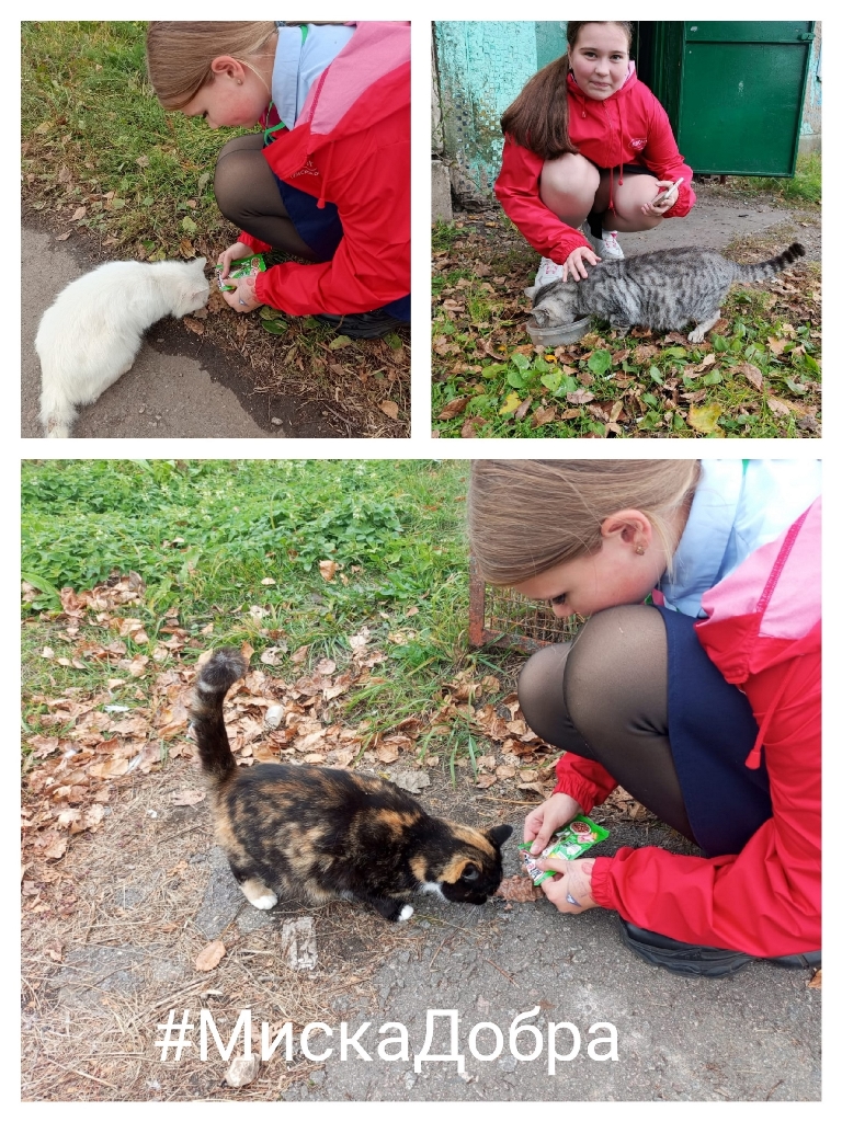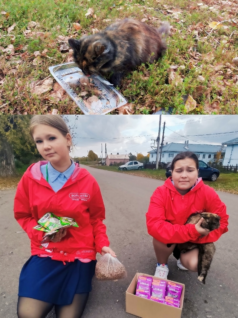 Ребята собрали корм для животных и передали его местной жительнице Дине Васильевне Шишкаревой, которая выхаживает семь кошек и пять собак. Также миску добра получили ещё 8 уличных кошек.