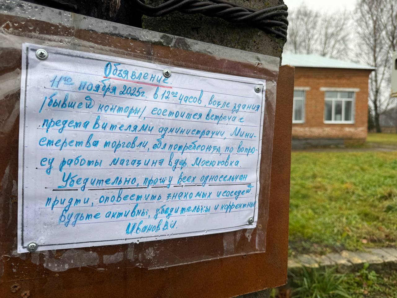 На столбе около здания бывшей конторы висит объявление - староста деревни приглашает односельчан на встречу по поводу решения самого острого на сегодня вопроса в Мосюковке – работы местного магазина.