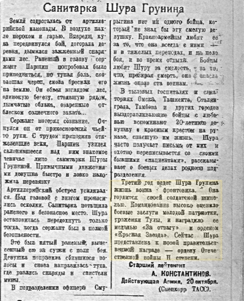 Публикация Константинова А.И. "Санитарка Шура Грунина" в газете "Большевистское слово"