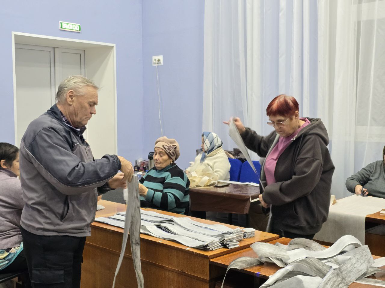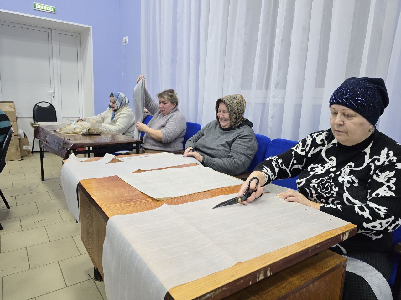 Повсеместно в нашем районе работают пункты, в которых женщины, объединившись, готовят помощь для фронтовиков. Им, разумеется, помогают и мужчины, но таких мало. Поэтому женщины особенно ценят поддержку своих односельчан-мужчин и бесконечно благодарят их за помощь. Так вот получается, что женщины плетут маскировочные сети, заливают окопные свечи, готовят домашнюю еду для чьих-то сыновей, которых уже давно считают своими. «Они все наши!» - то и дело повторяют женщины, совершенно не разделяя ребят на фронте на земляков и уроженцев других городов. Их руки не останавливаются ни на день – плетут нашлемники, делают сети, чтобы по-матерински укрыть от беды детей.