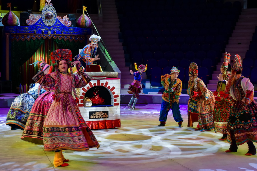 Начинается действо с рождественской ярмарки - на арену высыпают скоморохи и русские барыни в кокошниках. Какая же ярмарка без медведей? А вот и косолапые - пляшут, кувыркаются, гоняют на самокате и даже балансируют на канате!