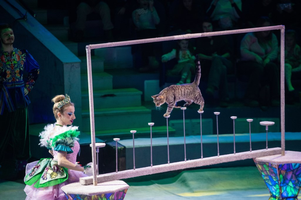 На арену вылетают кошки - обычные, русские простонародные, черно-белые и тигрово-полосатые. Но что они вытворяют! Даже прыгают через кольцо, словно настоящие тигры.